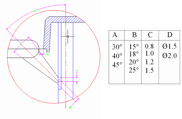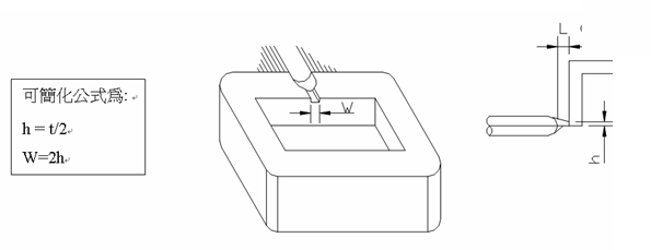 適用于大部塑料、各種側(cè)邊允許澆口痕跡的制品,開在制品的邊緣或邊緣頂面,又分標(biāo)準(zhǔn)入水、搭接入水和扇形入水,下圖中t為產(chǎn)品壁厚,L一般為(0.8—1mm)
